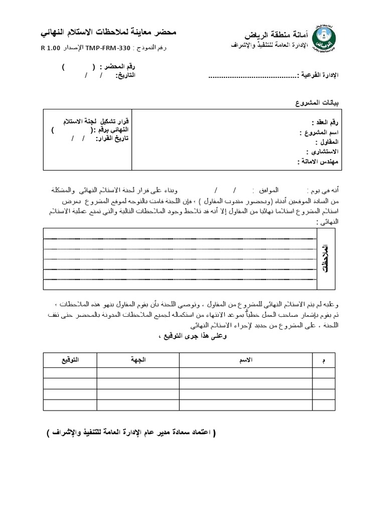 Tmp Frm 330 محضر معاينة لملاحظات الاستلام النهائي